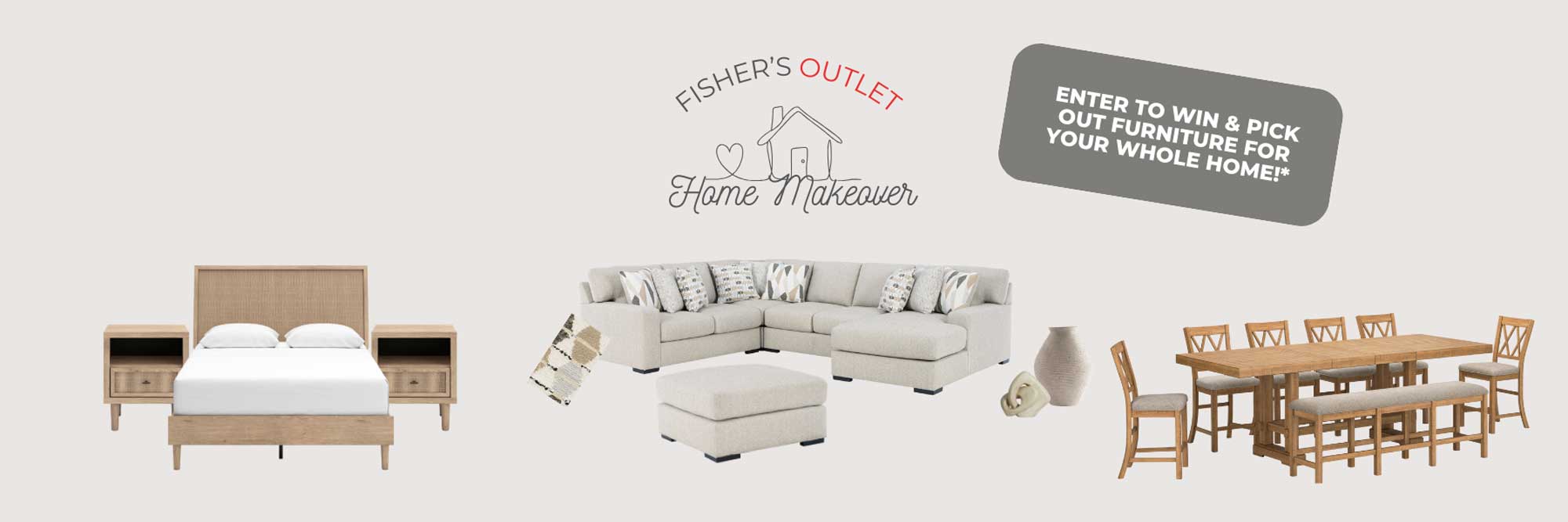 *Winner will be contacted via text, email and social media (if applicable). If the winner does not respond within [48–72 hours], another winner may be selected. By accepting the prize, the winner agrees to allow the use of their name and image for promotional purposes. Fisher Home furnishings reserves the right to modify, suspend, or cancel the giveaway at any time due to unforeseen circumstances. Any attempt to manipulate or abuse the giveaway process may result in disqualification. Winner will be selected at random from all eligible entries. Winner is responsible for any applicable taxes. $7,000 value taken from MSRP prices. No discounts or sales will qualify. Some exclusions may apply, see store for details.