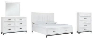 Includes king panel bed with 2 storage drawers (headboard, storage footboard and rails), 6-drawer dresser with mirror, and 5-drawer chest