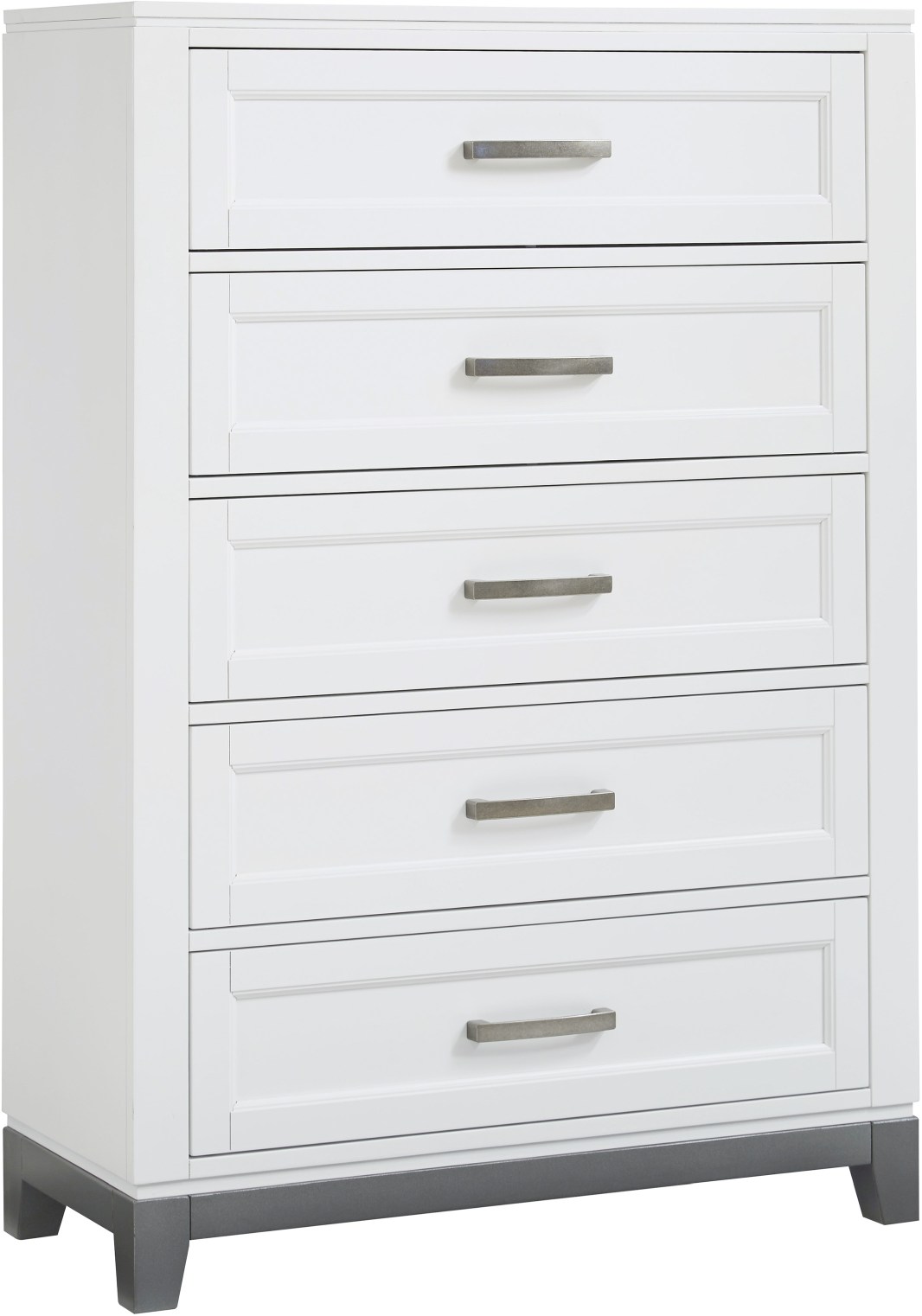 If you love that touch of vintage charm, but want something with a contemporary edge, this chest of drawers suits your style beautifully. Crisp, clean white finish and floating top design paint a pretty picture. Shaker style drawer fronts, satin nickel-tone knobs and contrasting steel colored base complete the aesthetic.