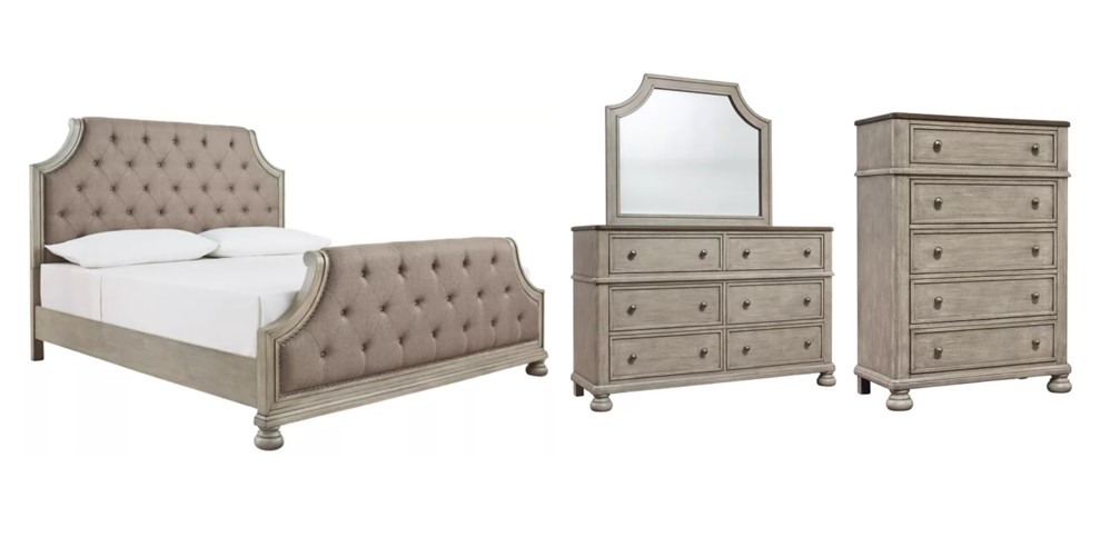 Includes panel bed (headboard, footboard and rails), dresser, mirror and chest
