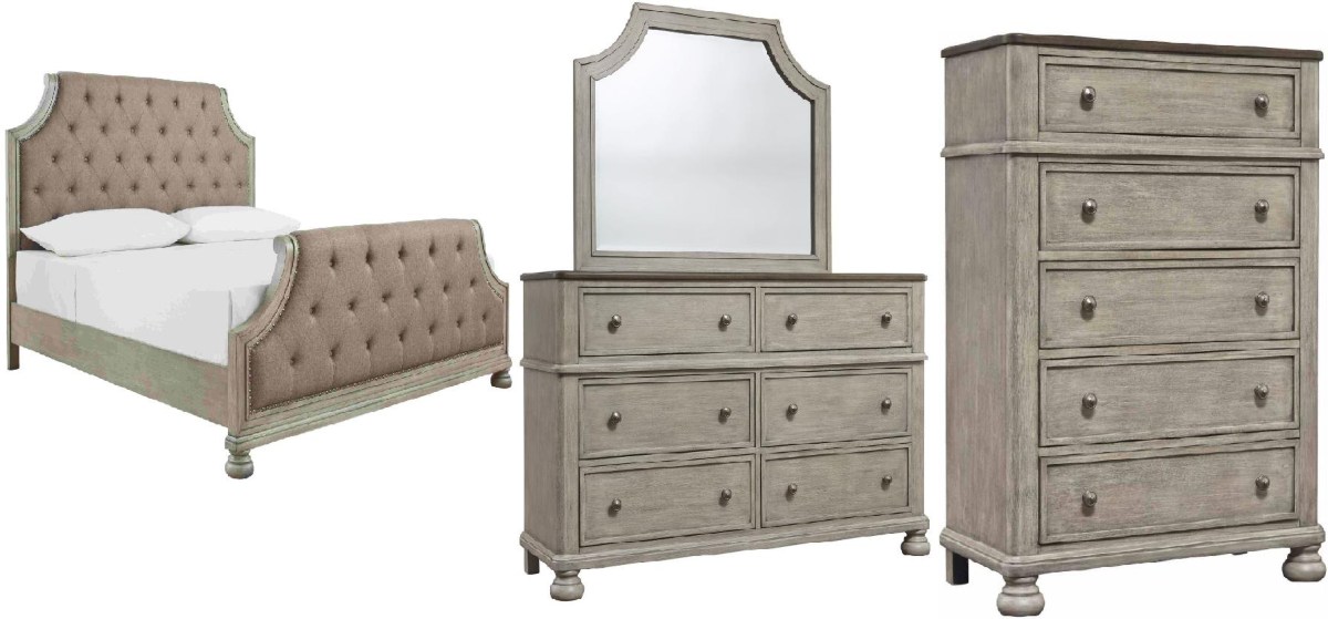 Includes king panel bed (headboard, footboard and rails), dresser with mirror, and chest