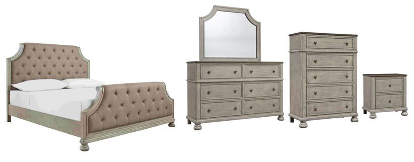 Includes queen panel bed (headboard, footboard and rails), 6-drawer dresser with mirror, 5-drawer chest, and 2-drawer nightstand