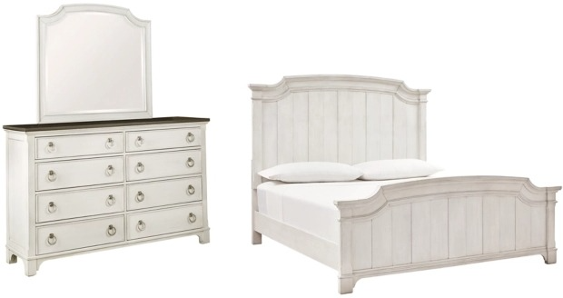 Includes panel bed (headboard, footboard, rails), dresser and mirror