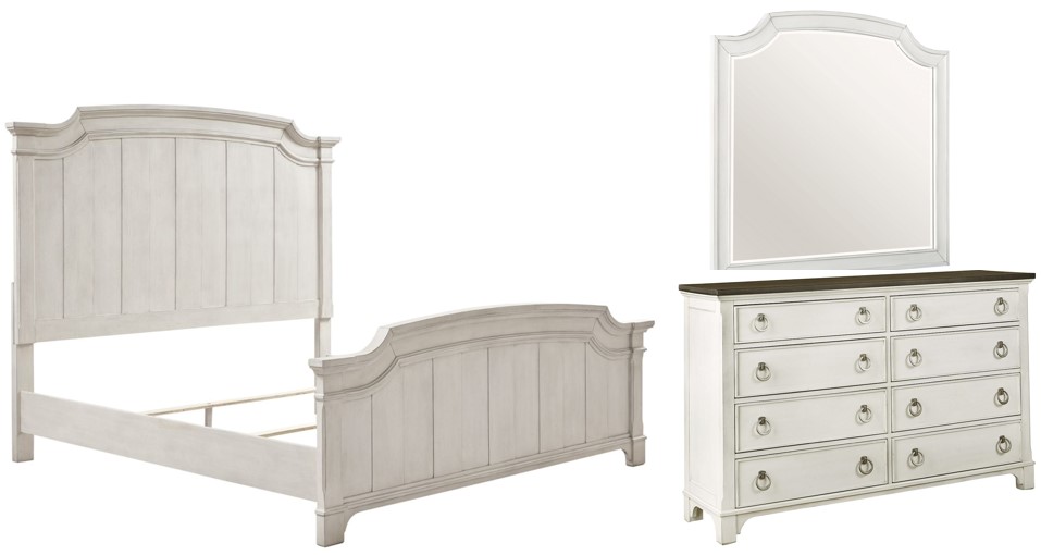 Includes king panel bed (headboard, footboard, rails), dresser and mirror