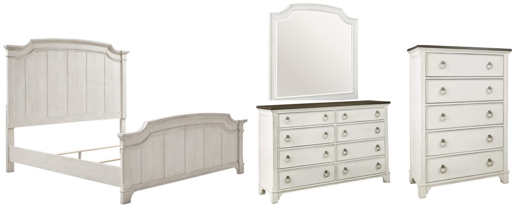 Includes queen panel bed (headboard, footboard, rails), dresser, mirror and chest of drawers