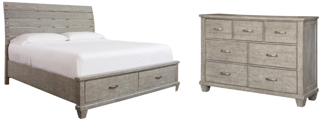 Includes panel headboard, footboard with storage, panel rails, roll slats and dresser