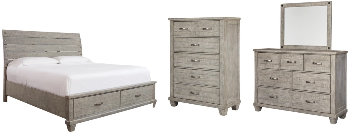 Includes panel headboard, footboard with storage, panel rails, roll slats, dresser with mirror and chest of drawers