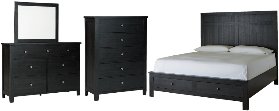 Includes bed (with headboard, storage footboard and rails with roll slats), dresser with mirror and chest, Made of pine wood, pine veneer and engineered wood, Distressed black-washed finish, Metal knobs with antiqued pewter-tone finish, Mansion height panel headboard with Shaker design, Footboard with 2 smooth-gliding storage drawers with dovetail construction, Included roll slats eliminate need for foundation/box spring, Dresser with 7 drawers , Chest with 5 drawers, Top drawers felt lined; dovetail drawer construction, Mirror attaches to back of dresser, Assembly required