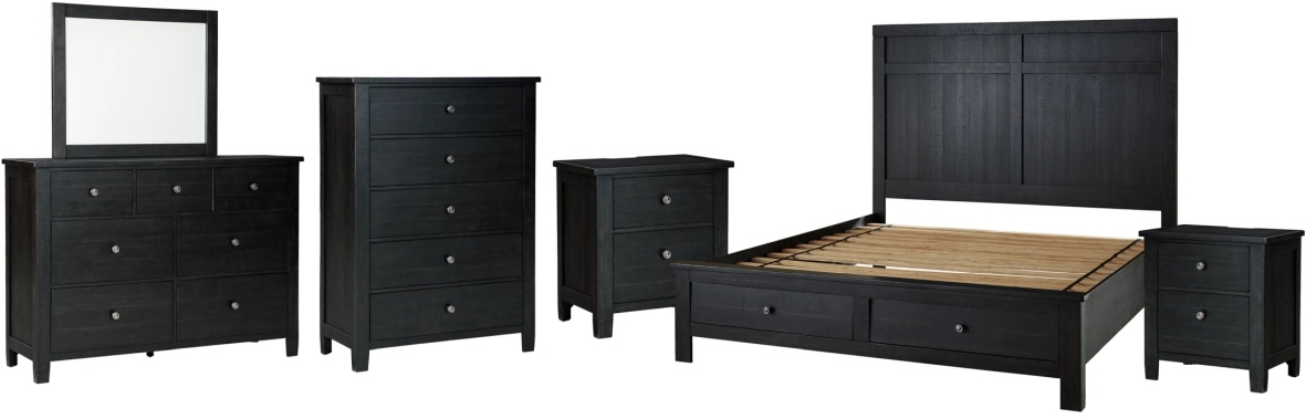 *Queen panel bed (with headboard, storage footboard and rails with roll slats), dresser with mirror, chest and 2 nightstands only, all other products are sold separately. Images may not reflect actual size. Furniture color in images may differ in person; see retailer for actual finish.