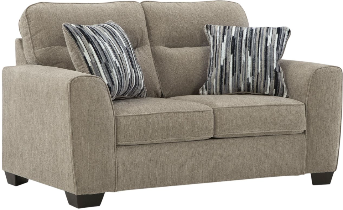 Strike a balance between the indulgent comfort you crave and the contemporary aesthetic you long for. The fabulously soft, mocha-colored upholstery of this loveseat takes neutrals to new heights. Geometric-patterned accent pillows perfect the richly on-trend aesthetic.Read More