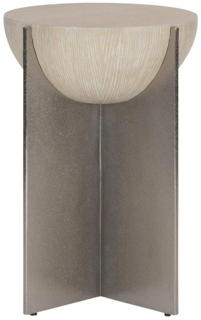 A pedestal of intersecting metal planes forms the unique base on the Solaria accent table. Crafted from cast aluminum in a shiny nickel finish, the base supports a half sphere of cast resin in a Dune finish.Read More