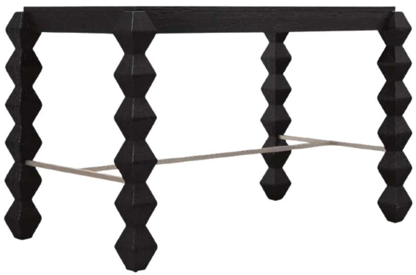 unique piece in the collection, the Xaden Gathering Desk is distinguished by its Charred black finish, achieved using the ancient Japanese technique of Shou Sugi Ban, which mimics the look of burnt wood. The desk features sculpted legs and a metal crossbar stretcher in pewter finish for additional support and style.Read More