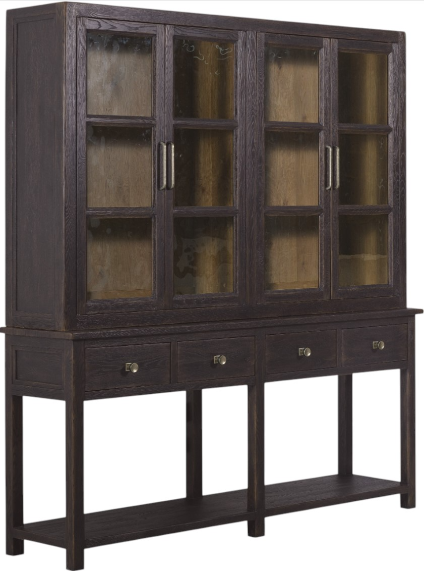 With its dramatic burnt timber finish, this sideboard brings moody depth and rustic character to dining spaces. Crafted with four glass-front doors and adjustable shelves for display, as well as four self-closing drawers including a removable silverware tray, this piece is both versatile and visually striking.Read More