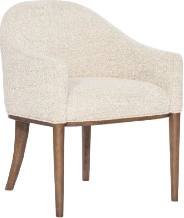 Elevate your dining setting with the Eleana upholstered arm chair, crafted with a light caramel walnut veneer frame and beige fabric upholstery. The welt trim detailing and tapered wood legs exude sophistication, while the classic linen fabric blend (polyester, viscose, and linen) adds durability.Read More