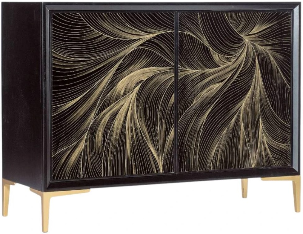 Finish: Black finished exterior with glass painted door fronts featuring gold abstract willow motif and gold-colored metal legs