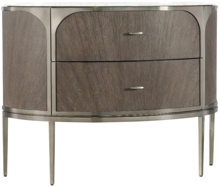 Architectural and timeless with a luxe mixture of materials, the Modern Mood nightstand is a statement piece. Featuring a demilune shape and two self-closing drawers, the nightstand has a metal frame, legs and slender pulls and a white and gray marble top.Read More