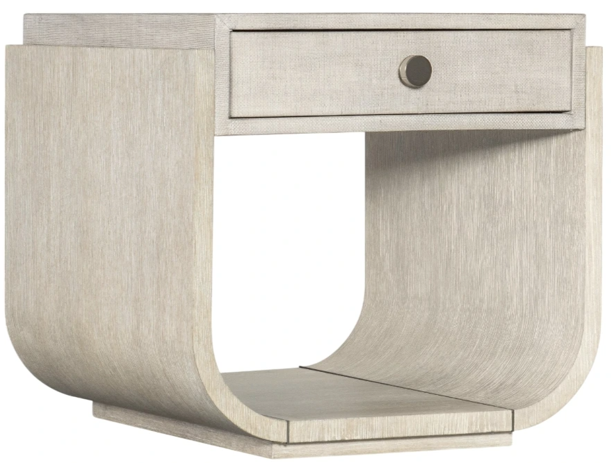 Architectural and timeless with a luxe mixture of materials, the striking Modern Mood rectangle end table is crafted of quartered oak veneers with a raffia-wrapped drawer front and top. Featuring rounded sides, the table is finished in diamond, featuring wire-brush detailing with crystal-like alabaster and pewter hues.Read More