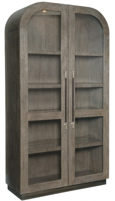 Architectural and timeless with a luxe mixture of materials, the Modern Mood arched display cabinet combines oak veneers, metal and glass in a stunning statement piece. Crafted of quartered oak veneers with wire-brush detailing in the softly-sophisticated mink finish, the cabinet has two wood-framed tempered glass doors with soft-close hinges and magnetic catches.Read More