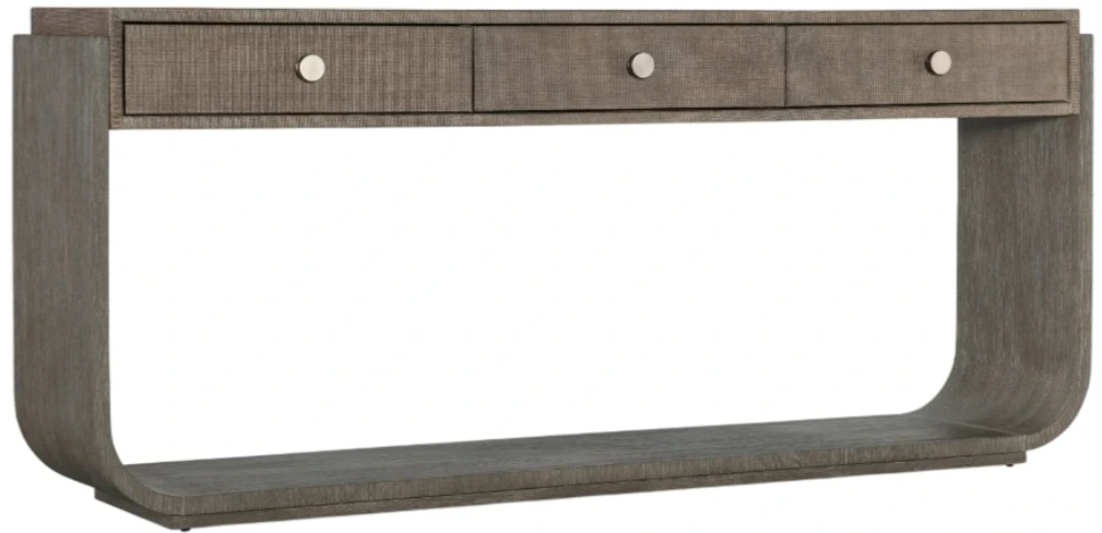 Symmetrical and timeless with a luxe mixture of materials, the soft and sophisticated Modern Mood console table has a narrow rectangle shape with rounded sides and a raffia-wrapped drawer front and top. Crafted of quartered oak veneers with wire-brush detailing.Read More