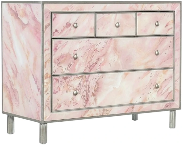 A tribute to the incredible strength and fortitude of those affected by breast cancer, the Eternal chest features reverse painted class and watercolor-like pink hues complemented by silver accents, ribbed silver legs and silver-finished round metal knobs. The five self-closing drawers have pink interiors.Read More