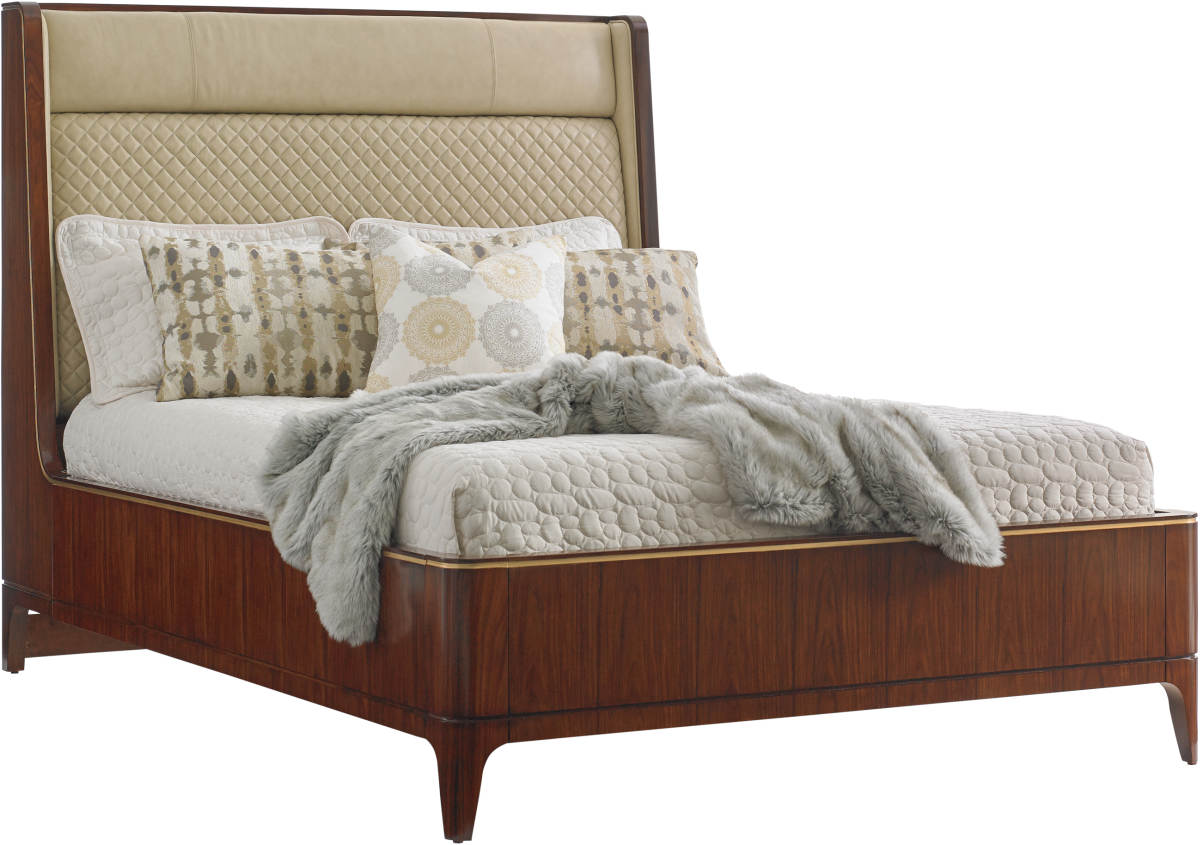 The queen upholstered bed showcases the elegant lines of the collection. Supple ivory leather on the headboard is impeccably tailored in a diamond quilted Chanel-inspired design with soft returns at each end.Read More