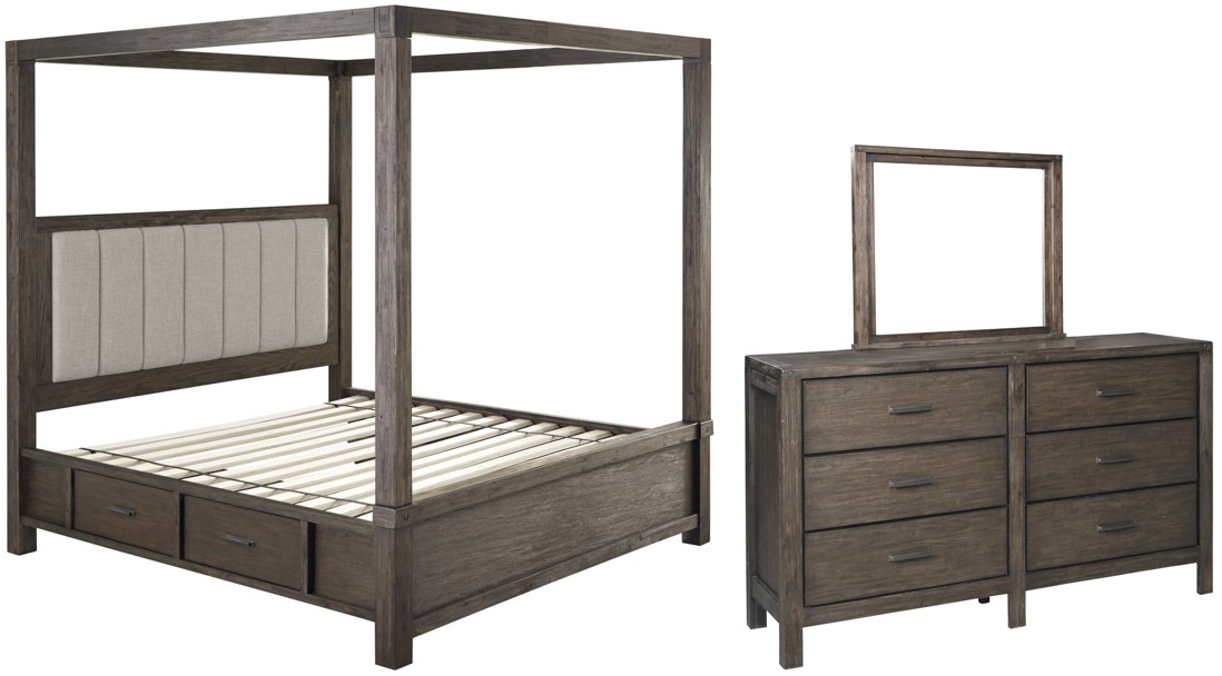 Includes queen canopy bed (headboard, roll slats and storage side rails) and dresser with mirror