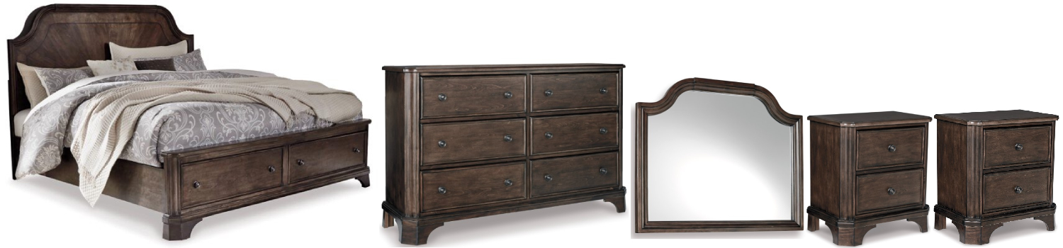 Includes queen panel bed (headboard, storage footboard, rails with roll slats), dresser with mirror and 2 nightstands