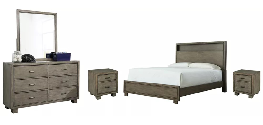 Melding modern and mid-century influences, this bedroom set brings a fashion-forward perspective to bedroom furniture. The set’s ultra clean lines—which include an open gallery-rail headboard, flush-mount drawers and bold, blocky feet—are beautified with a smoky gray finish that’s delightfully distinctive.Read More