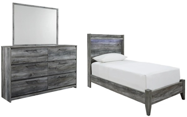 Includes twin panel bed (headboard, footboard,rails) and 6-drawer dresser with mirror