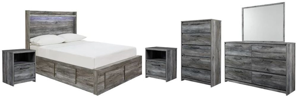 Includes full panel bed (headboard, footboard with storage, storage rails and roll slats), dresser with mirror, chest and 2 nightstands