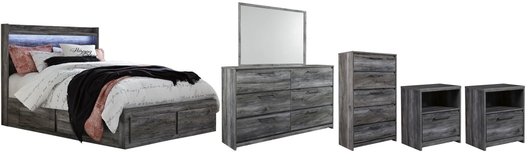 Includes panel bed (headboard, footboard,rails), 5-drawer chest, 2 nightstands and dresser with mirror, Made of engineered wood with replicated grain, Headboard with dimmable LED light strip, Power cord included; UL Listed, Mattress and foundation/box spring available, sold separately, Dresser and chest with smooth-gliding drawers with faux-linen lining, Nightstand with single drawer, open cubby and USB charging port, Assembly required