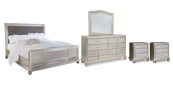 Includes king sleigh bed (headboard, footboard and rails), dresser, mirror and two nightstands