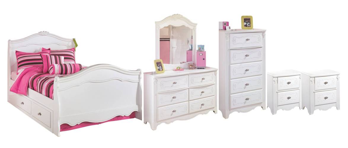 Includes full-size sleigh bed with 4 storage drawers, dresser, mirror, chest of drawers and two nightstands