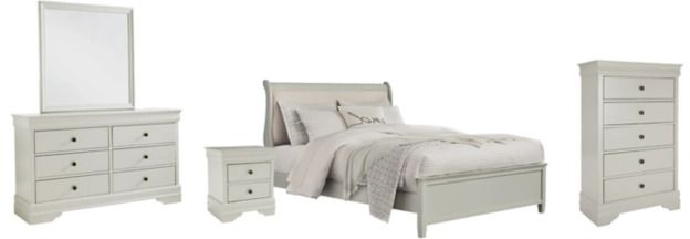 Includes headboard, footboard, rails, dresser with mirror, chest of drawers and nightstand