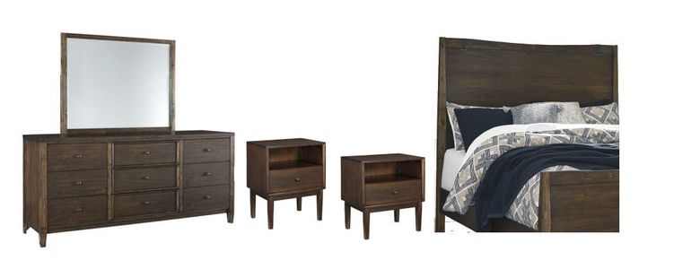 Includes queen panel headboard, dresser, chest of drawers and 2 nightstands
