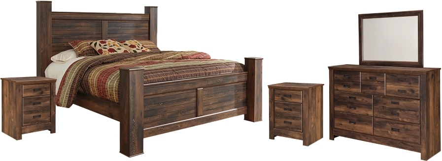 Includes king poster bed (with posts, headboard, footboard and rails), 7-drawer dresser with mirror and two 2-drawer nightstands