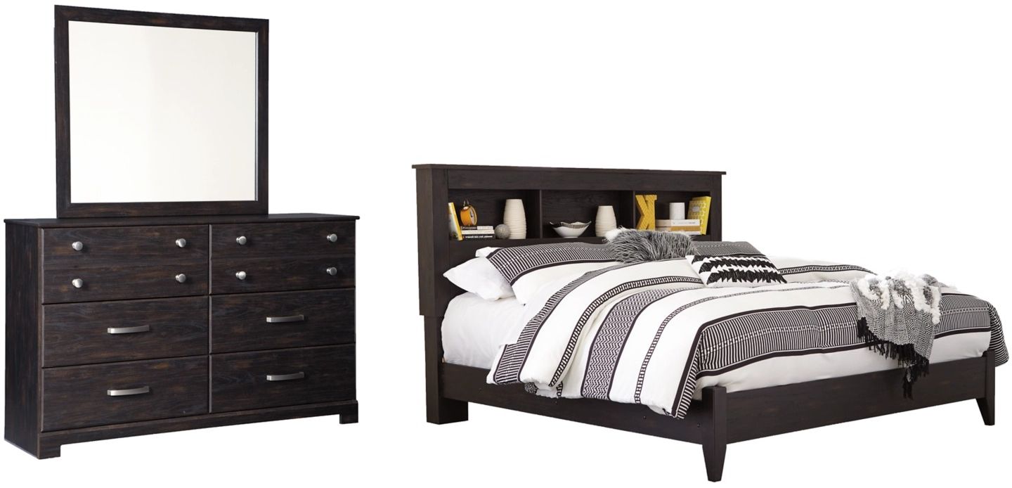 This bedroom set is turning heads with its clean, streamlined vibe. Dark brown finish has a gorgeous distressed effect, adding two-tone visual interest. Large cubbies and drawers provide ample space for your decor and essentials, while nickel-tone accents add a neat touch of shine.Read More