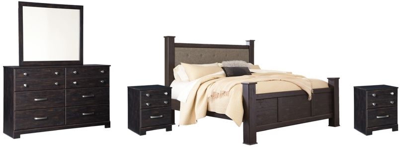 Includes poster bed (headboard, footboard, rails and posts), two 2-drawer nightstands and 6-drawer dresser with mirror