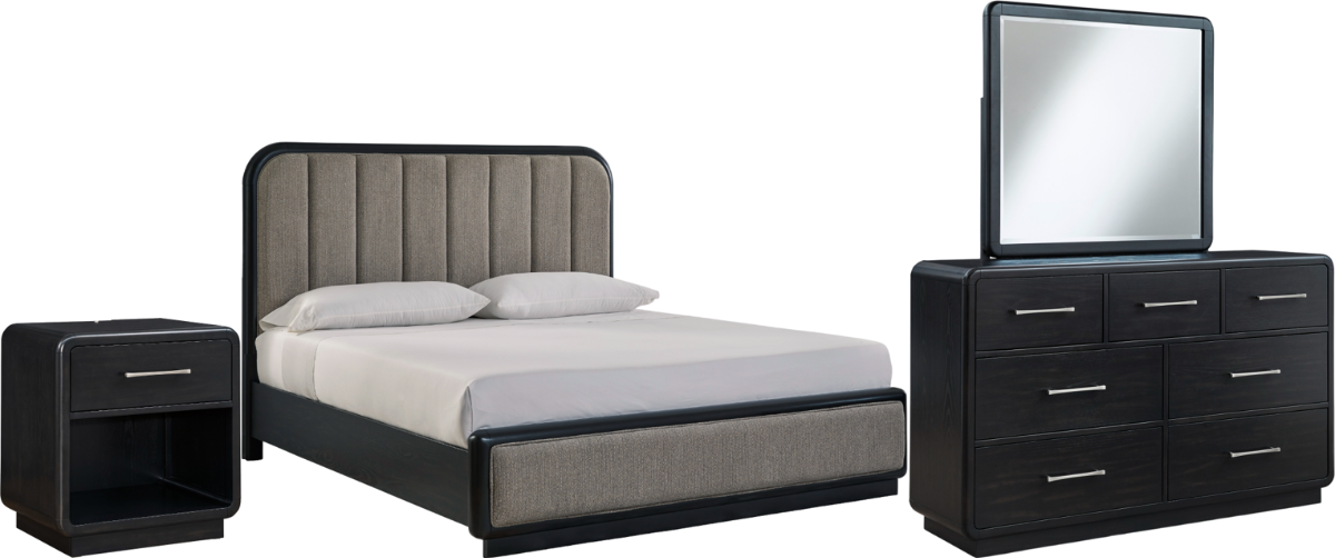Includes king upholstered panel bed, dresser, mirror, and one drawer night stand
