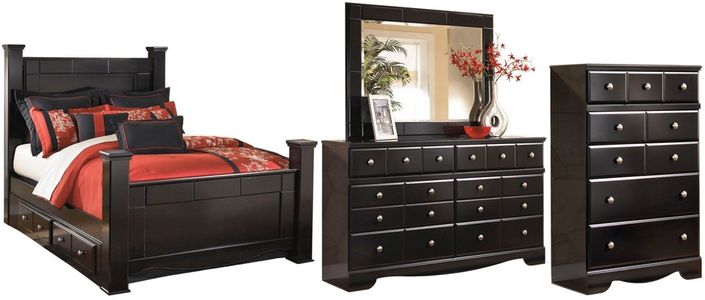 Includes queen poster bed (headboard, footboard, posts and rails), dresser with mirror and chest of drawers