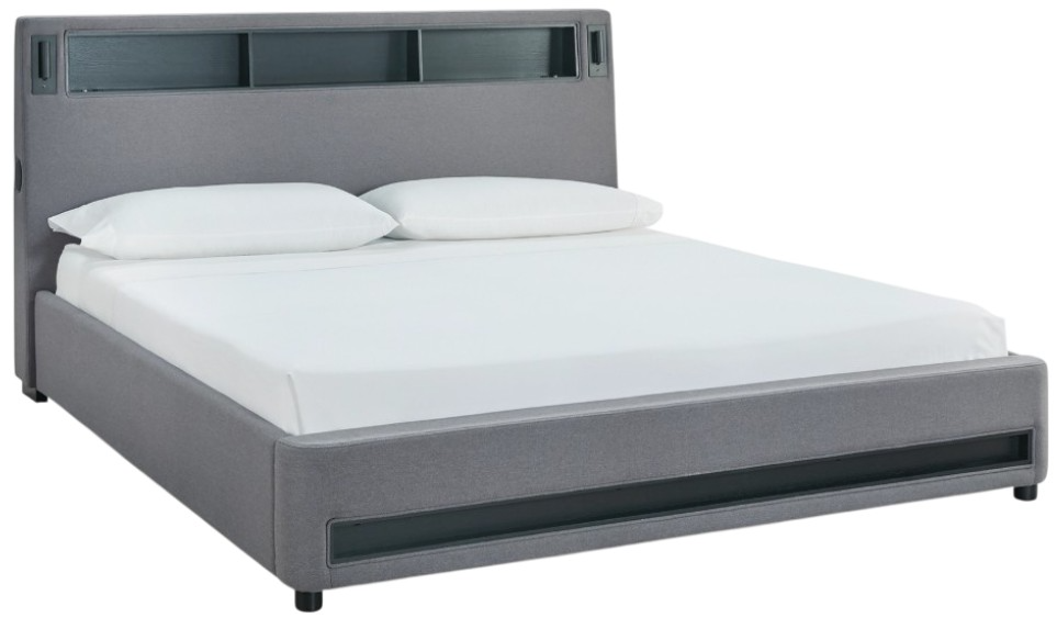 Snooze in style with this king upholstered bed. It brings delightful function to winding down before bedtime, with an adjustable LED reading light on each side. And for added flair, multicolored ambient lighting brings an ultra-cool vibe to the overall look. Combining modern convenience with captivating design, this bed revamps your restful retreat like never before.Read More