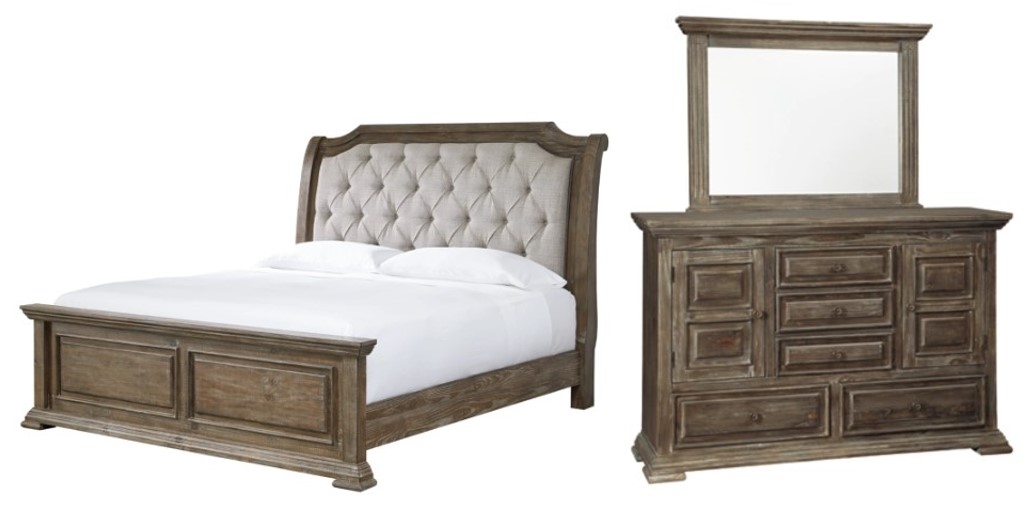 Includes panel bed (headboard, footboard and rails) and dresser with mirror