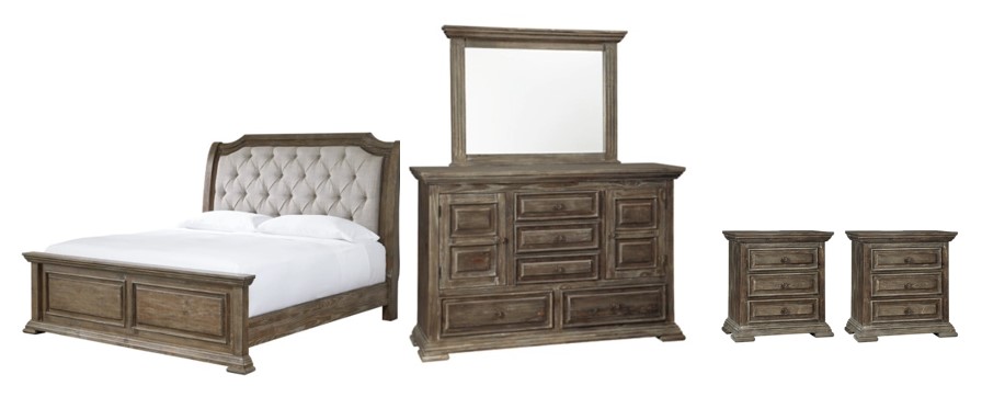 Includes panel bed (headboard, footboard and rails), dresser with mirror, and two nightstands